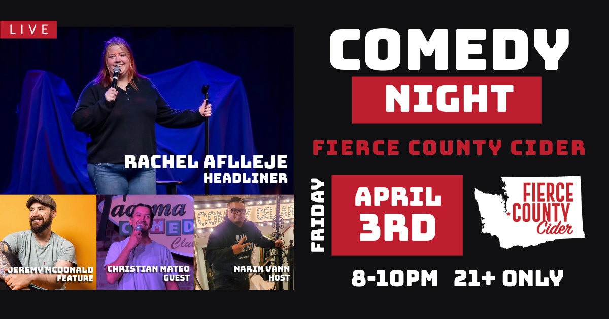 Comedy is back, Friday, April 3! Join us at the Fierce County Cider tap house in South Hill for laughs, hard cider and craft beer as we welcome the following lineup of comedians: HEADLINER: Rachel Aflleje FEATURE: Jeremy McDonald GUEST: Christian Mateo HOST: Narin Vann Tickets are $10 plus taxes and fees, available online now!...