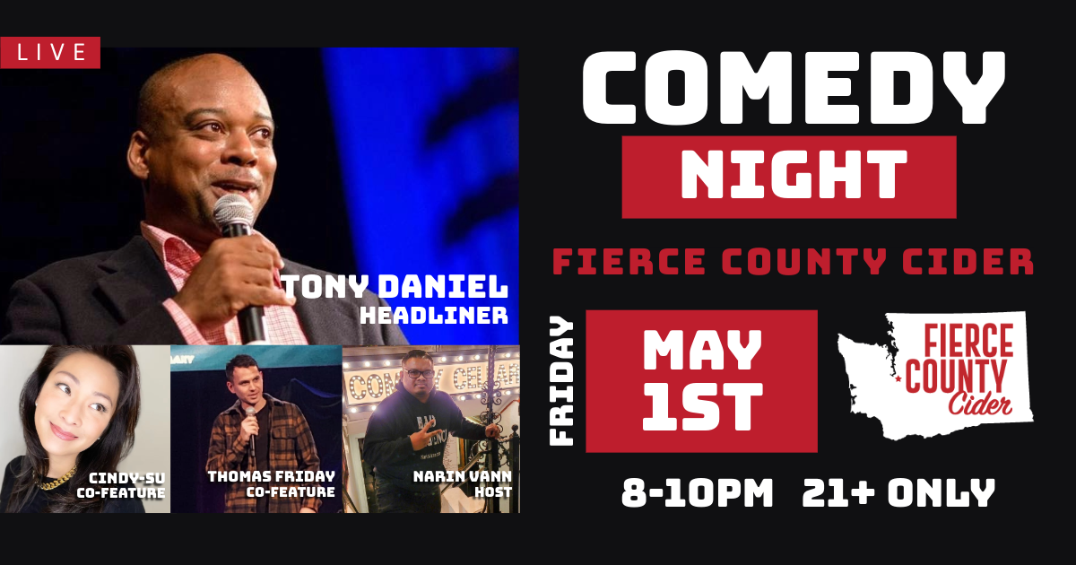 Comedy is back, Friday, May 1! Join us at the Fierce County Cider tap house in South Hill for laughs, hard cider and craft beer as we welcome the following...